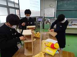 3月2日(水)の技術の授業は、檜材の木目を生かすために、ヤスリがけを丁寧に行ってから、拭き漆の技法で本立てを仕上げました。塗料を木地に塗り、余分な塗料を拭き取る作業を繰り返すことで美しい艶と透けた木目のある素敵な本立てを制作しました。