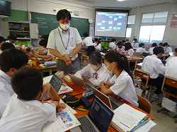 6月27日(月)の5校時と6校時に校内研究授業を行いました。国語の授業では、多角的に考えることについて学習し、生活の中から多角的に考える事例を観点を明らかにして見いだす活動をしました。英語科の授業では、英会話を広げるテクニックを会話文から見つけ出し、交流する国を決定した上で、交流する内容をグループで考える活動を行いました。楽しくしっかりと学ぶことができるよう授業研究会を行っています。