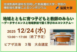 こちらから「 地域教員希望枠を活用した教員養成大学・学部の機能強化事業によるシンポジウム「地域とともに育つ子どもと教師のみらい~データサイエンスと地域参加で築く学びのエコシステム~」の開催案内 」をご覧ください。