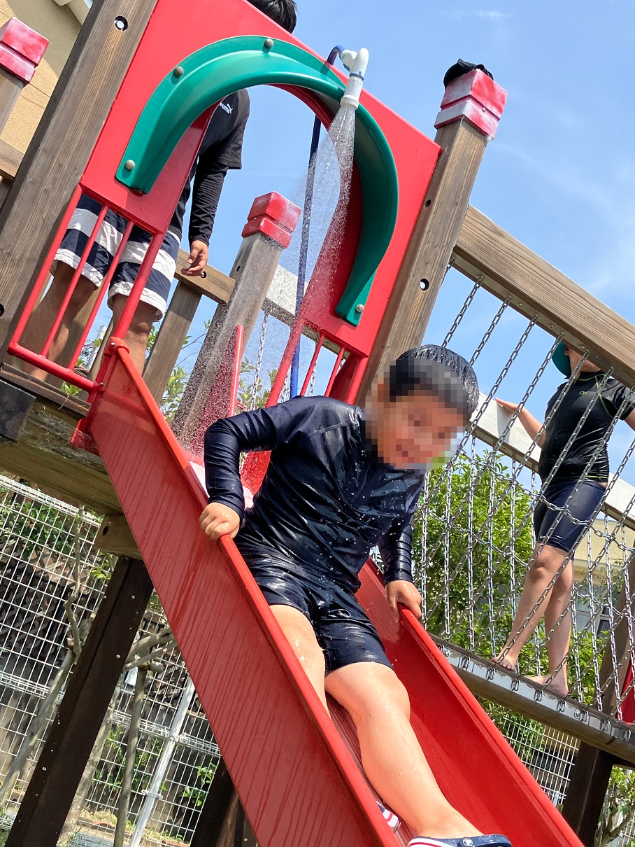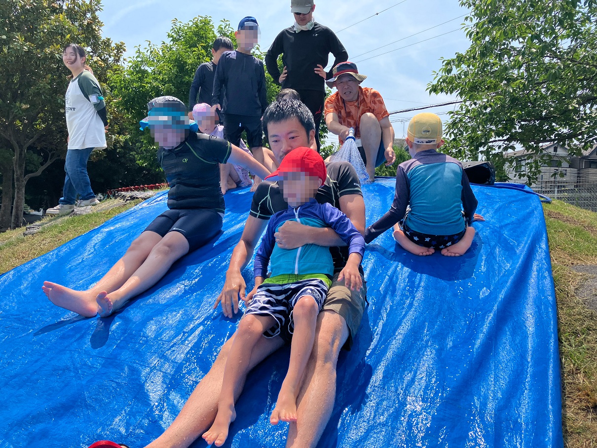築山と滑り台2か所を使って滑って遊びました。当日は大学生が来ており、先生や友達だけではなく、学生と楽しく触れ合っていました。