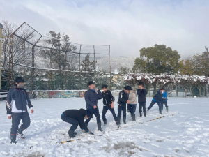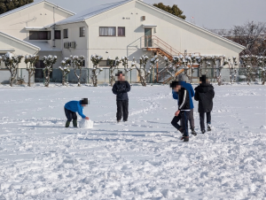 この日は朝からたくさんの雪が積もりました。交通機関への影響も比較的少なく、みんな元気に学校へ集まることができました。グラウンド一面に広がる雪を見て、みんなのテンションも上がります!雪玉を遠くへ投げたり、雪を転がして雪だるまを作ったりと、自然の中でたっぷり全身を動かすことができました。冬ならではの体験を通じて、また一つ大切な思い出が増えました!