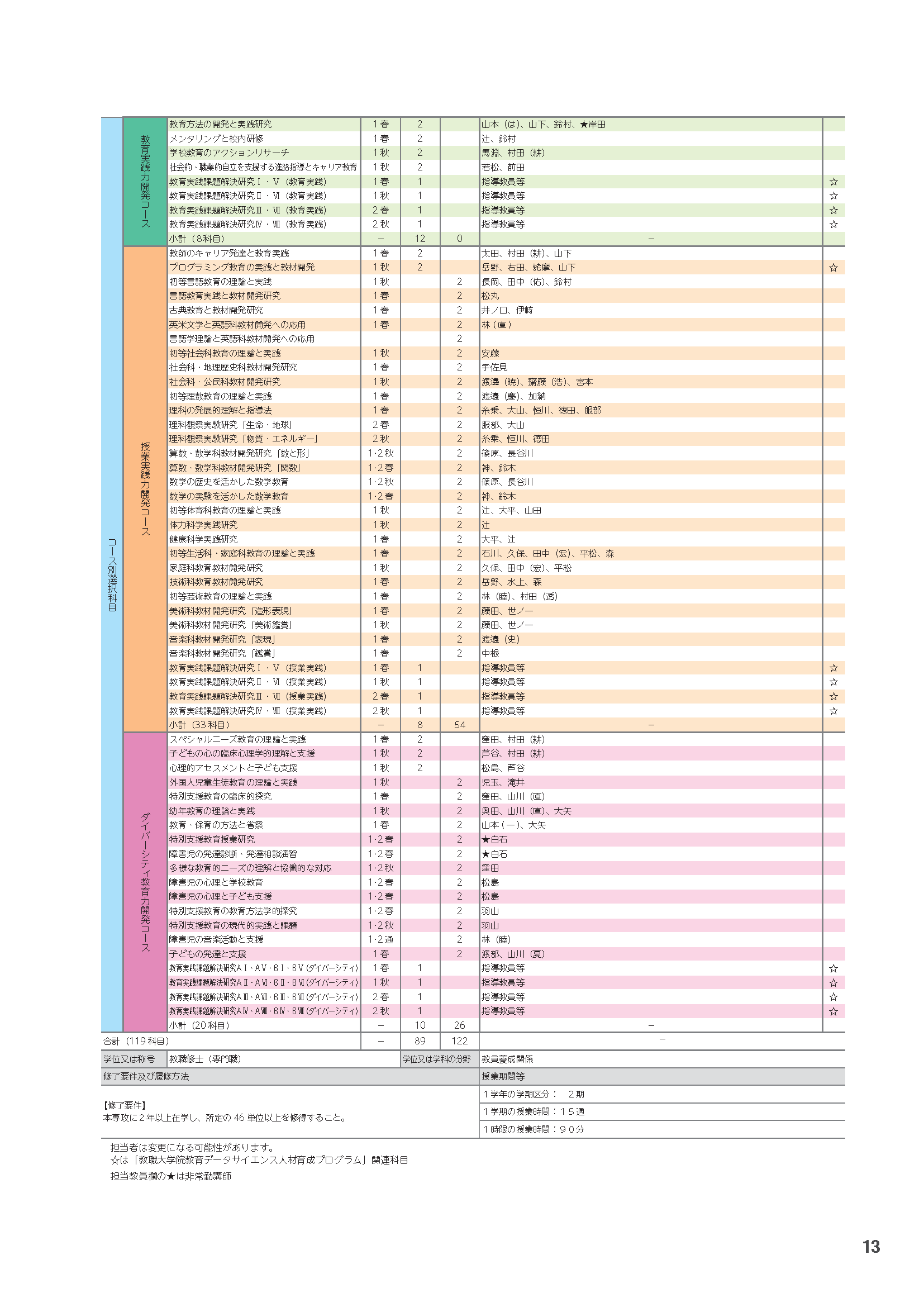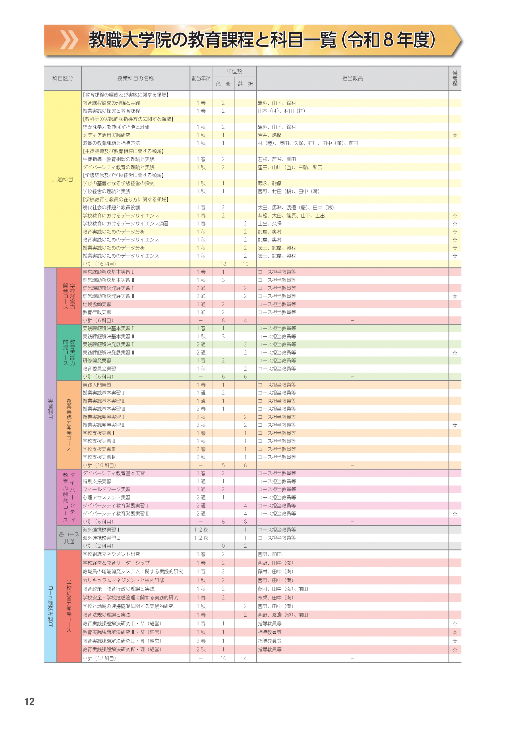 | 授業科目区分等 \ コース名 | 学校経営力開発 | 教育実践力開発 | 授業実践力開発 | ダイバーシティ 教育力開発 | ||