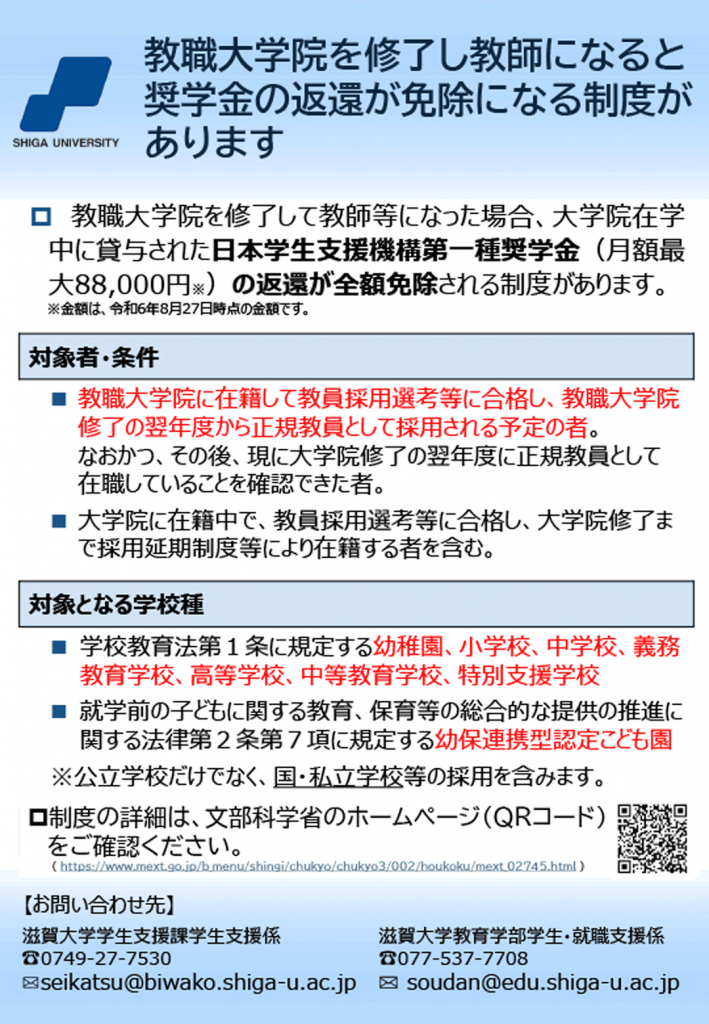 学生生活・学生支援 奨学金・授業料免除 ホームchevron_forward学生生活・学生支援chevron_forward奨学金・ 授業料免除 教職大学院を修了して教師になると奨学金の返還が免除になる制度があります。詳しくはこちらをご覧ください。 各種奨学金・授業料免除については、こちらからご確認ください。