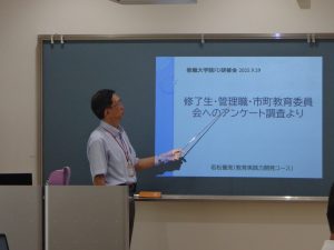 そこで、今年度の研修会では、昨年度、修了生や修了生が勤務する学校の管理職、修了生が在籍する自治体を対象に実施したアンケート結果をもとに、滋賀大学教職大学院の今後の在り方を考える場を提供しました。
