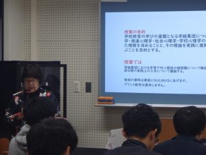 この公開授業は、教育学部生に教職大学院の雰囲気を身近で感じ、理解を深めてもらう機会とするために新たな試みとして企画されたものです。今回、本科目の第5回「学校経営目標と学校教育目標の関係」に関する授業を学部生に広く公開するとともに、FD活動の一環として教職大学院教員も参加しました。