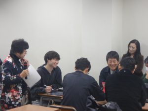 本科目は全8回にわたって行われ、現職教員学生及び学部新卒学生が共に履修します。前半4回では研究者教員により教育心理学や発達心理学といった理論に関する授業を実施した後、後半4回では実務家教員により理論を実践に展開する方法について具体的な事例解説や演習が行われます。今回の授業では、岸田蘭子特任教授から学校経営の重要性、学級担任の心構えといった内容について解説がされた後、現職教員学生と学部新卒学生が混合でグループを組み、学級経営計画の案を実際に考えるワークが行われました。このグループワークでは学部生も教職大学院生に交じって参加し、現職教員学生と学部新卒学生が熱心に議論する様子を間近で体験しました。参加した学部生からは、「現職教員の方と共に学んでいる様子を見せていただき大変新鮮だった」といった声があり、学部生にとって教職大学院での協働的な演習の様子を知る大変貴重な機会となりました。