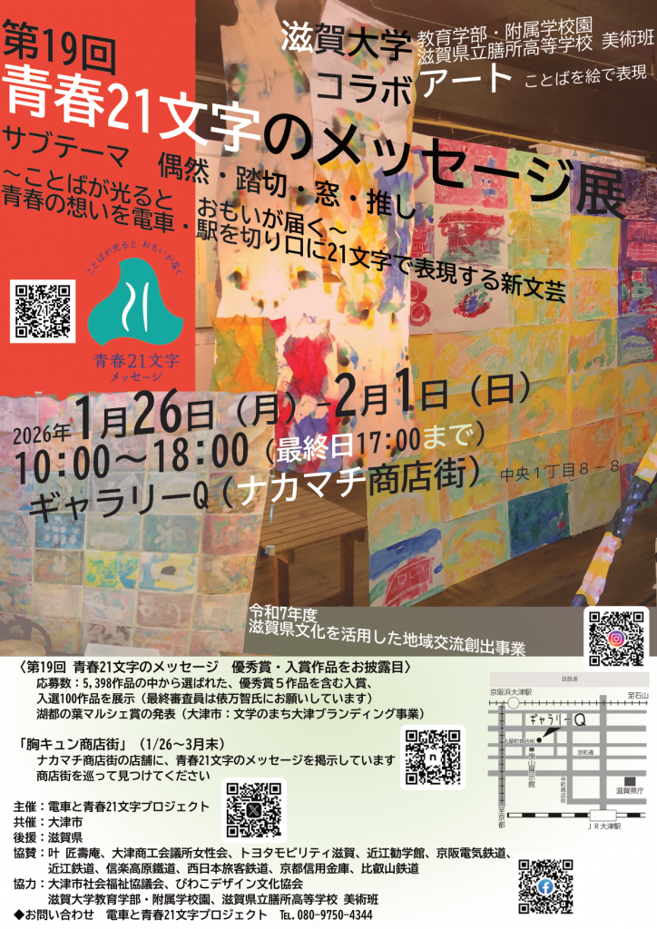 滋賀大学教育学部・附属学校園が協力する 「第19回 青春21文字のメッセージ展」が、2026年1月26日(月)~2月1日(日)ギャラリーQ (ナカマチ商店街)において開催されます。