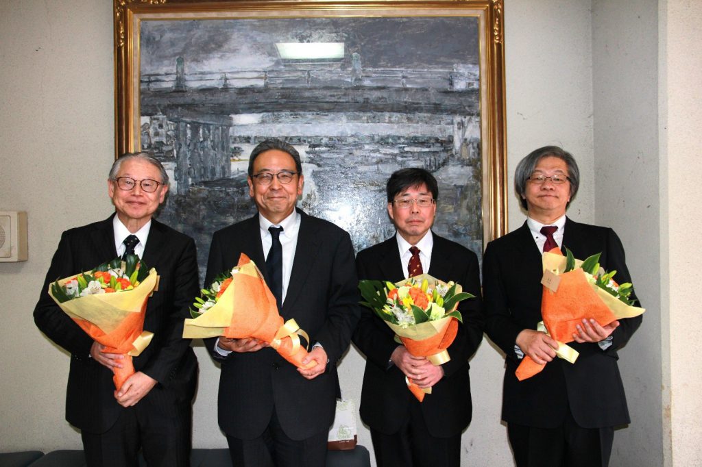 左から花束を手にする岸本教授・中村教授・馬場教授・若林教授